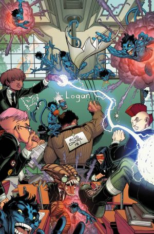 “Just Another Day in Westchester County” opens with Logan filling in Kitty and Hank about his dual activities as the leader of the underground mutant strike force X-Factor, and his day job of Headmaster and professor of English Lit (Hooray!) at The Jean Grey School for Higher Learning, of which Kitty and Hank are also high ranking faculty. Kitty in fact is the Headmistress. Then the scene flashes to a faculty meeting with Bobby Drake/Iceman and Rachel Grey/Marvel Girl in attendance where Kitty announces that she has found her first gray hair. Later on we’re treated to some classroom scenes in which Deathlok is a guest lecturer, and we’re introduced to Genesis (“call me Evan”), the young Apocalypse clone who recently surfaced over in the pages of Uncanny X-Force. He’s a bit of a tortured soul, and just one day might be the death of all the X-Men, but for right now, he’s just a young man trying to discover who he is, like most of the kids at the school and those of his age in real life. He isn’t the only one going through an identity crisis though, Warren Worthington/Angel is as well, and after what he just endured that’s not surprising. What is surprising though is his current delusion might be based in some disturbingly shocking reality…
