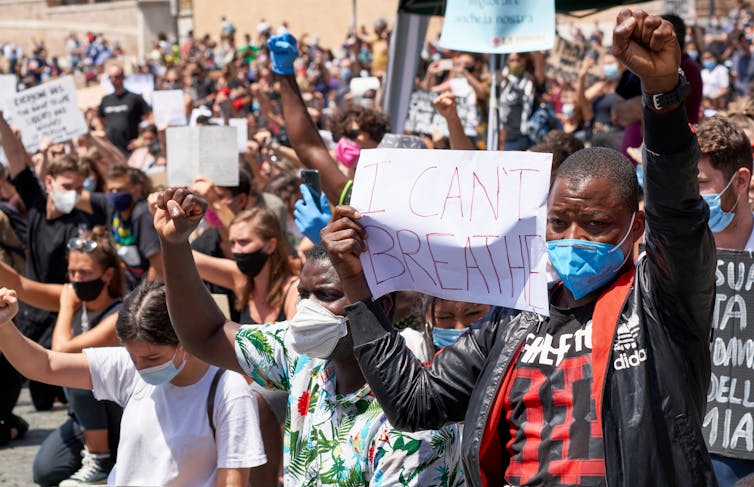 Manifestation contre le racisme en souvenir de George Floyd le 7 juin 2020, à Rome, en Italie. Un homme brandit une pancarte disant « I can’t breathe » (Je ne peux pas respirer). Cette phrase est devenu emblématique de la lutte des Noirs contre la violence policière. shutterstock Johnniqua Charles, une sans-abri de la ville de Dillon, en Caroline du Sud, ne se doutait pas qu’un rap improvisé lors de son arrestation allait devenir l’hymne de plusieurs manifestations antiviolence policière aux États-Unis et ailleurs dans le monde.