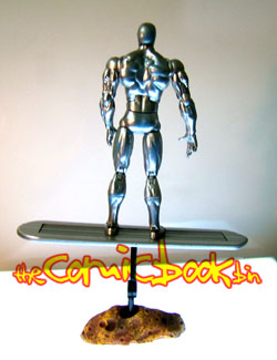 The surfer’s board si more than a prop for the Silver Surfer. It’s part of him. The board is made of plastic and metal. The metal parts allow one to pose the Silver Surfer on the board in various ways. There’s a plastic arm under the board, connecting it to a meteorite base. To best pose the Silver Surfer on his board, you’ll have to play with the arm under the board to achieve the best stability.