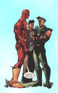 Green Arrow (Oliver Queen) on Qward with Hal holding Barry Allen's torn